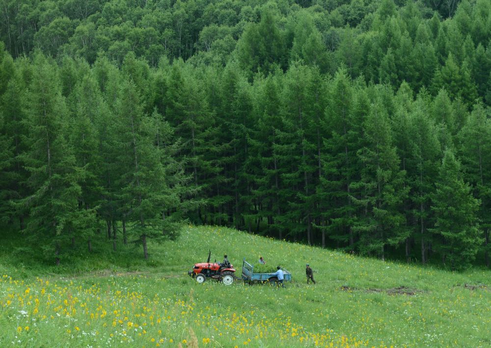 ↑工人在塞罕壩機械林場千層板林場內運輸苗木(2013年7月11日攝)。