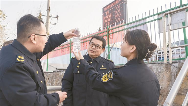 咸陽市長武縣執法人員在亭南煤礦入河排污口進行采樣監測。咸陽市生態環境局 供圖