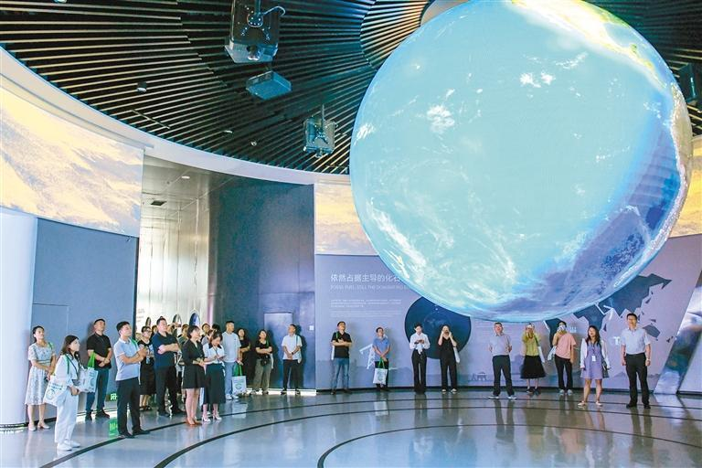 當天11:00,在隆基綠能智慧能源展覽館內記者看到,借助聲、光等技術,巨大的地球造型裝置與周圍設施共同展示太陽能的魅力,讓大家直觀了解能源轉型的重要性。