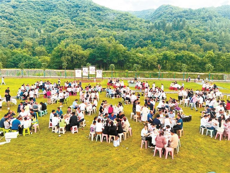 吃著火鍋唱著歌,又一場“千人火鍋宴”在白馬灘鎮“暖山河畔”露營基地舉辦……來自全國各地的千余名游客在這青山綠水間徜徉。