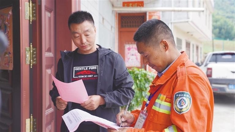 寧陜縣梅子鎮安坪村生態環境保護網格員伏先華(右)上門宣傳護林防火知識。