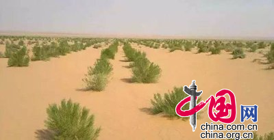 ③以封沙育草區為前沿,阻止流動沙丘前移。主要采取封育保護措施,禁止采樵和放牧,促進天然植被恢復。對于裸露沙丘,輔助飛播和人工播種耐旱沙生灌木或半灌木,實現了裸露沙丘上天然植被的近自然恢復和更新,有效地控制了流沙的活動和前移。
