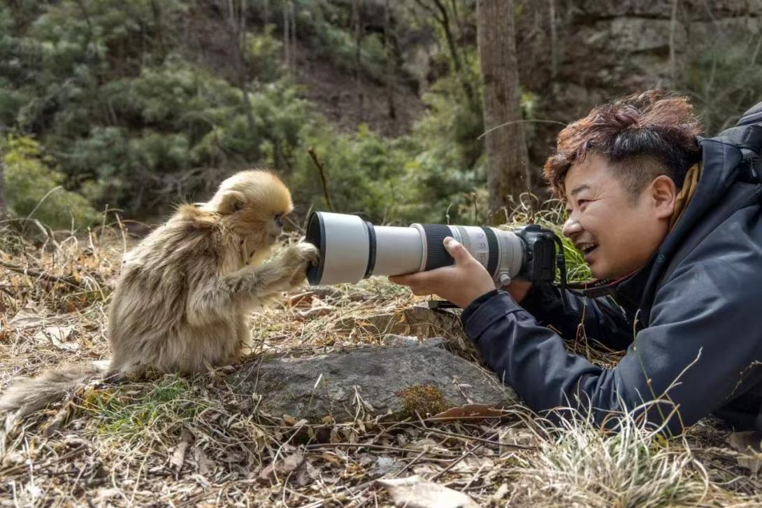 湯勇在拍攝秦嶺中的金絲猴幼崽