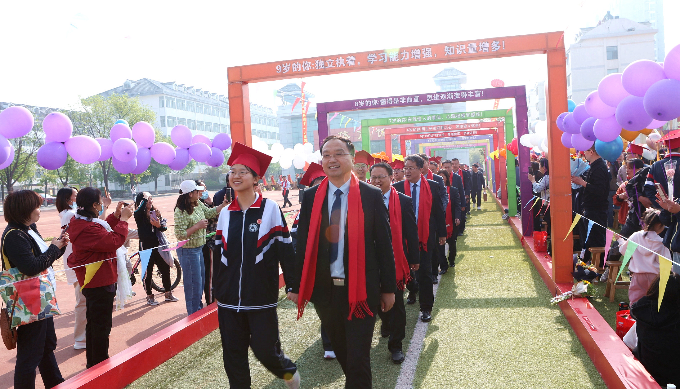 儀式現場,由18組七彩單門組成的成人門格外引人注目,寓意著同學們成人后絢麗多彩的未來。在18響禮炮聲中,學生與家長攜手共跨成人門,昂首闊步邁向人生新的階段。這一步,意味著他們將褪去青澀,承擔起更多的責任,踐行“修身,齊家,治國,平天下”的使命。