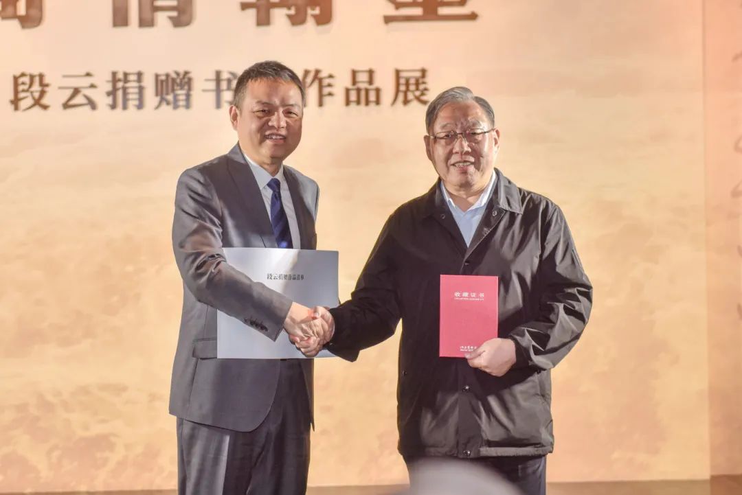 開展儀式上,段云先生家屬代表段曉飛與山西博物院院長王曉毅完成捐贈清單與證書互贈。王曉毅在致辭中高度評價段云先生“詩書濟世、德藝雙馨”的一生,指出其作品不僅是藝術耕耘的結晶,更折射出一位時代先賢與國家同頻共振的精神圖譜,期待展覽為公眾打開走近歷史與藝術的窗口。