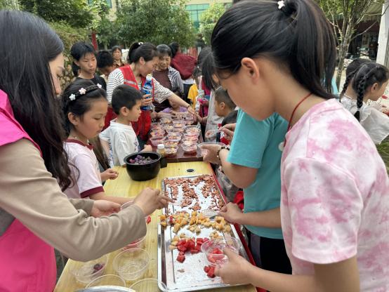 活動當天,孩子們在社工和志愿者的指導下,學習制作傳統消暑美食——冰涼粉。從調配原料到裝飾成品,每一個環節都凝聚著孩子們的用心與創意。義賣攤位前,小攤主們熱情吆喝,向過往村民介紹自己的作品,吸引了許多群眾駐足購買?,F場歡聲笑語不斷,既鍛煉了孩子們的溝通能力,也讓公益的種子在他們心中生根發芽。