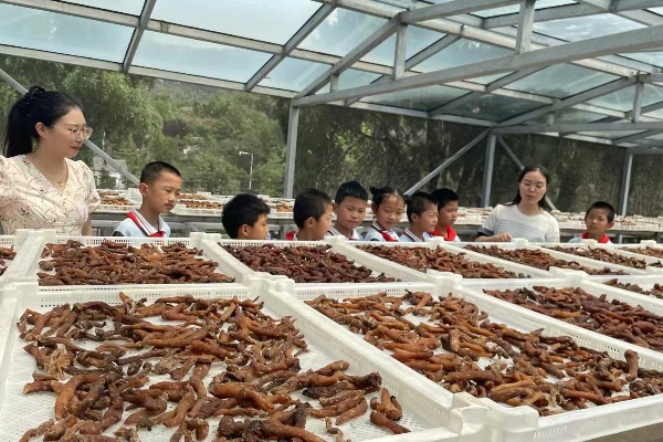 隨后,師生們來到無恙堂泰山黃精林下撫育基地,觀摩國家級非物質文化遺產“黃精九蒸九曬工藝”。從清洗、蒸制到晾曬,繁瑣的工序體現了古法制藥的嚴謹。工作人員介紹,九蒸九曬能充分激發黃精的藥效,使其滋補作用更顯著。孩子們認真記錄每一步工藝,不時提問互動,對傳統中醫藥的智慧贊嘆不已。