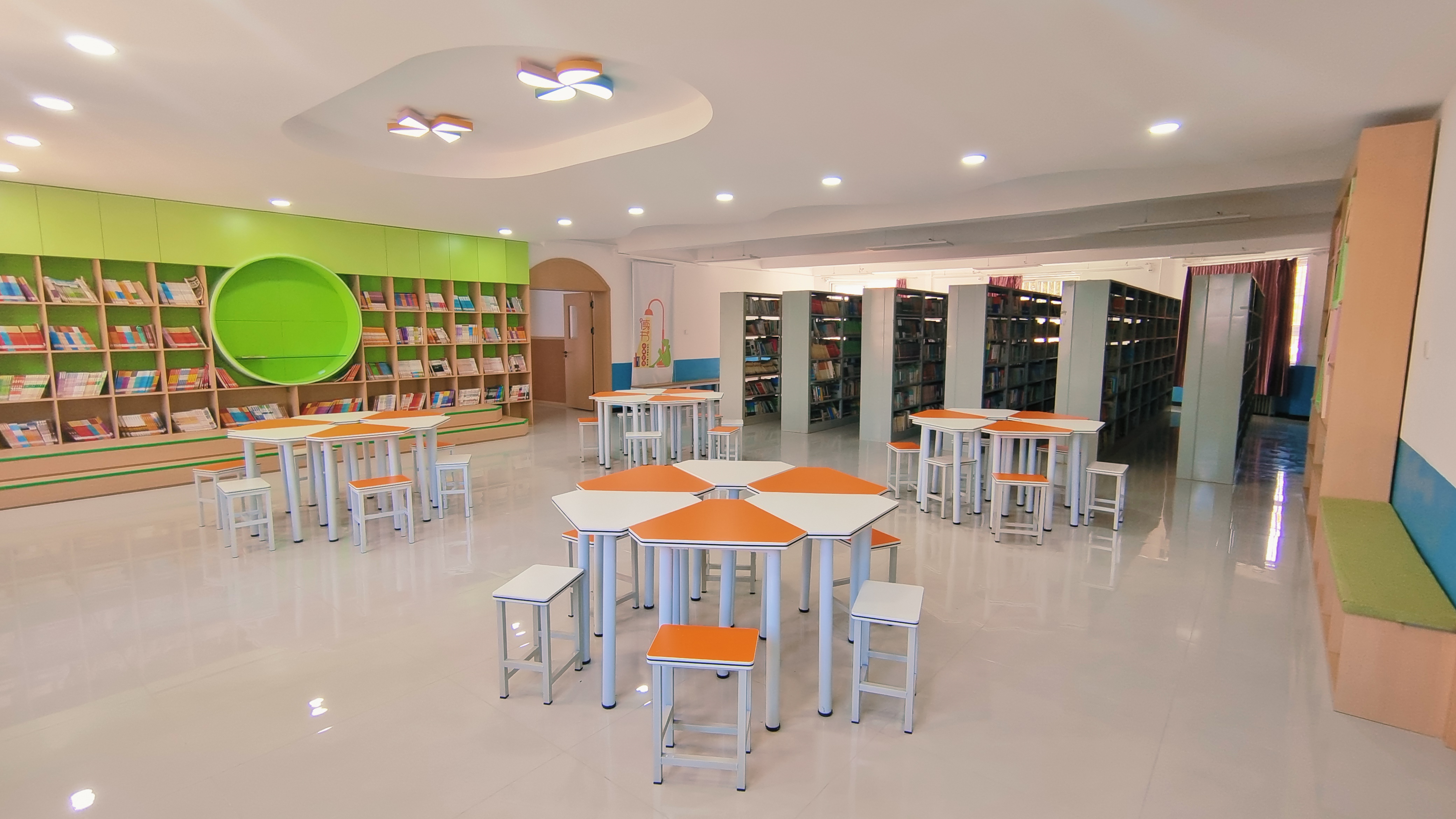 步入其中,寬敞明亮的空間令人眼前一亮。嶄新的木質書架整齊排列,琳瑯滿目的書籍涵蓋了文學經典、科普探索、歷史故事、藝術啟蒙等多個領域,儼然一座小型知識寶庫。柔和的燈光灑在書頁上,舒適的座椅排列有序,營造出溫馨而寧靜的閱讀氛圍,讓孩子們可以在此盡情遨游書海,享受閱讀的樂趣。