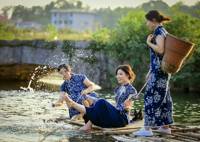2013年,外出闖蕩多年的楊彩虹,帶著女兒羅沙沙,毅然回鄉創立湖南藍印文化發展股份有限公司,并拜國家級非遺代表性傳承人蔣良壽為師,復活藍印花布傳統技藝。羅沙沙發揮大學所學專長,在學習傳統技藝的基礎上,大膽創新,設計出特色旗袍、禮服、枕套、遮陽傘等10多個系列的文創產品,廣受消費者喜愛。