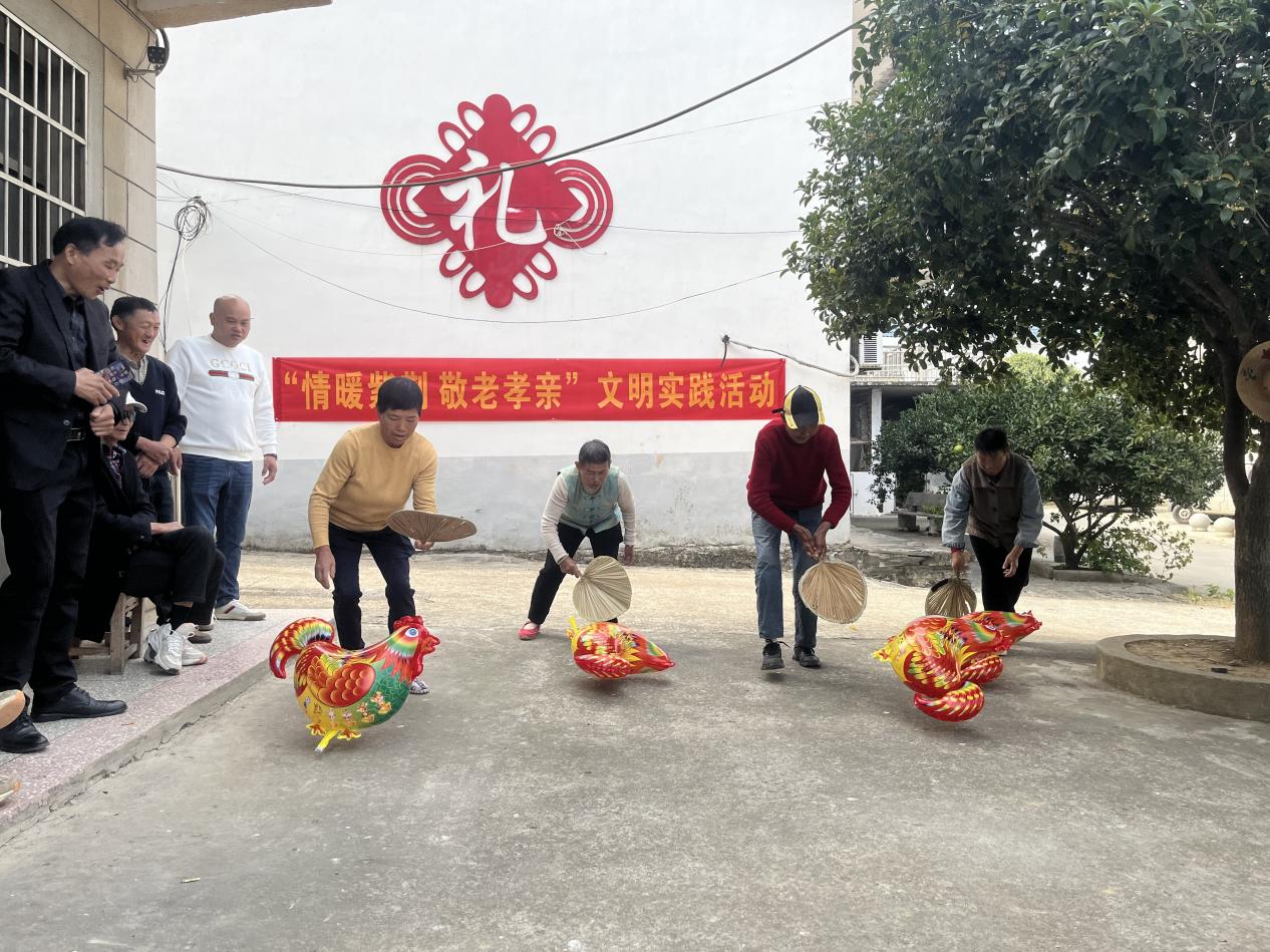 另一邊,紫荊村的趣味游戲區同樣熱鬧非凡?!班l村保齡球”環節,大家拿起籃球對準擺成陣列的礦泉水瓶,瞄準、投擲一氣呵成;“趕雞進籠”游戲里,老人們手持輕巧扇子,目光專注地盯著印有“土雞”圖案的氣球,輕輕發力將氣球“趕”向終點,動作間滿是童趣;“圈圈套?!庇螒蚋桥牌鹆碎L隊,老人們站在指定線外,瞄準心儀的醬油、肥皂、抽紙等日用品投擲套圈?!爸辛?!中了!”隨著一聲聲歡呼,成功套中心儀物品的老人臉上綻放出燦爛笑容,沒套中的老人也在大家的安慰下笑著繼續嘗試,歡樂與滿足的氛圍感染著在場每個人。