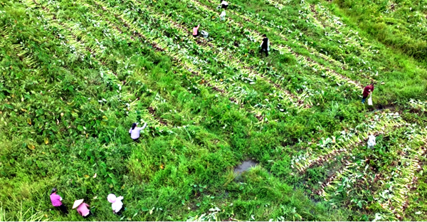 “得益于今年風調雨順,助農政策持續落實,馬嶺鎮2000多畝荔浦芋粉糯上市,地頭價每公斤接近6元?!痹趶V西荔浦市馬嶺鎮新寨村百畝荔浦芋種植基地,莫家凱正與工人忙于采挖荔浦芋。霜降前后,荔浦市5萬畝荔浦芋陸續上市,在荔浦廣袤的大地上,芋農分工協作分揀、包裝荔浦芋,開心地打包運輸,田間地頭一派熱火朝天的豐收景象。